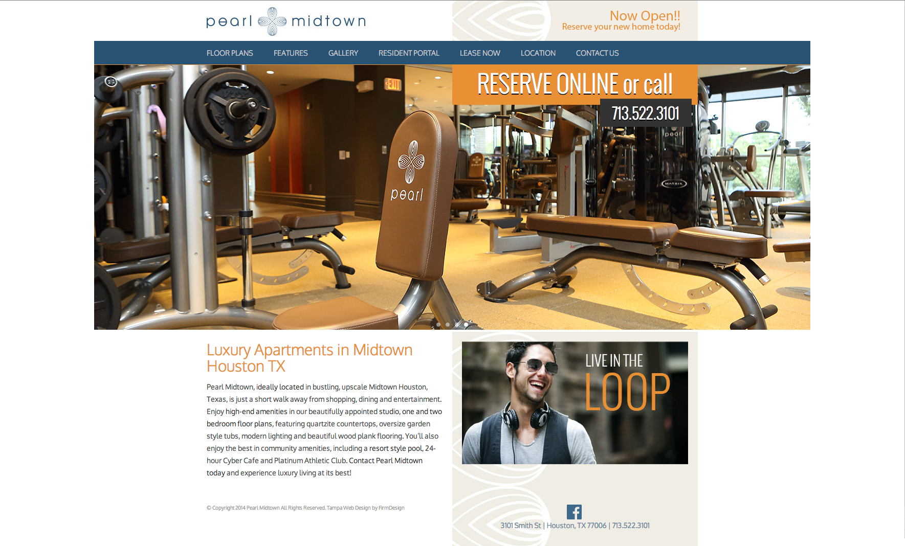FirmDesign specializes in the multi-family industry. The Pearl Midtown website highlights one of Houston's top A properties. The site features modern web technology such as responsive design and a custom content management system.